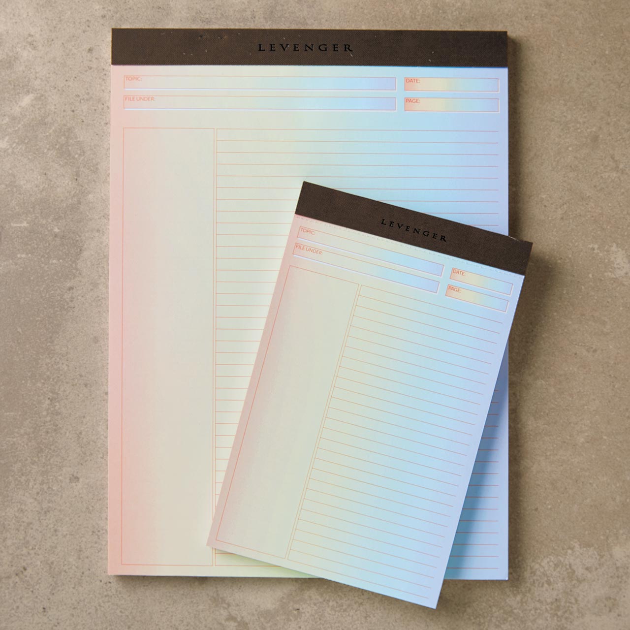 This Product Ships Free. Rainbow-bright annotation-ruled notepads for the paper aficionado. At Levenger, we understand being particular about paper. Our color gradient Freeleaf® notepad paper is smooth and substantial, friendly to all types of pen and ink and made with sturdy 100-gsm paper stock, with a firm cardboard pad backer for stability when writing. In fact, we believe the quality of these fine notepads can actually help you think better and capture brilliant ideas more effectively. Set of 2.