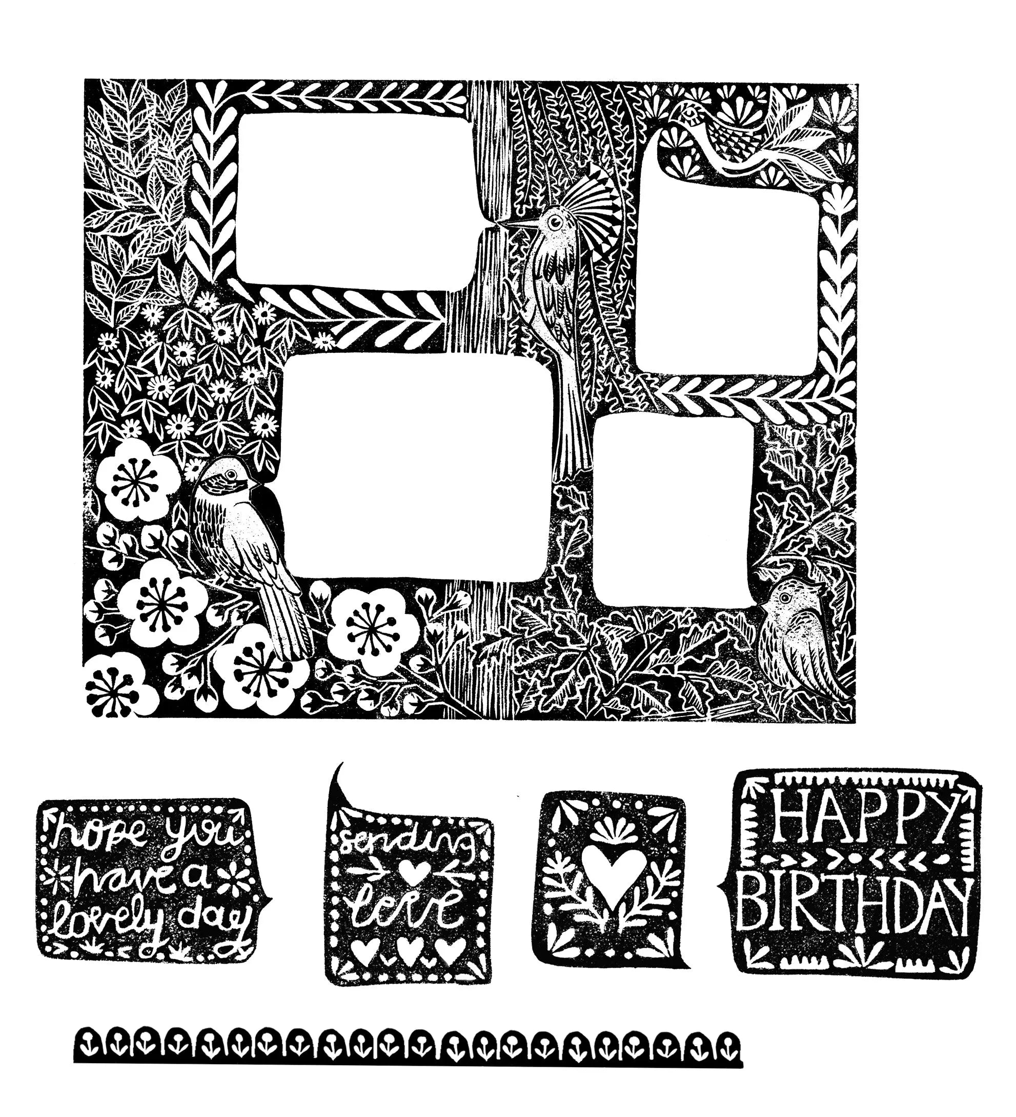 Set of Birds and Flowers Birthday Stamp 12X10cm and all the speech bubble stamps and border stamp. 6 stamps in total.